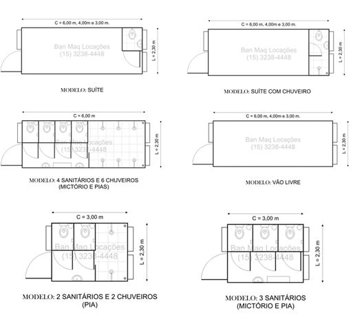 Disponibilizamos container no modelo padrão com três, quatro ou sete cabines